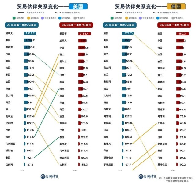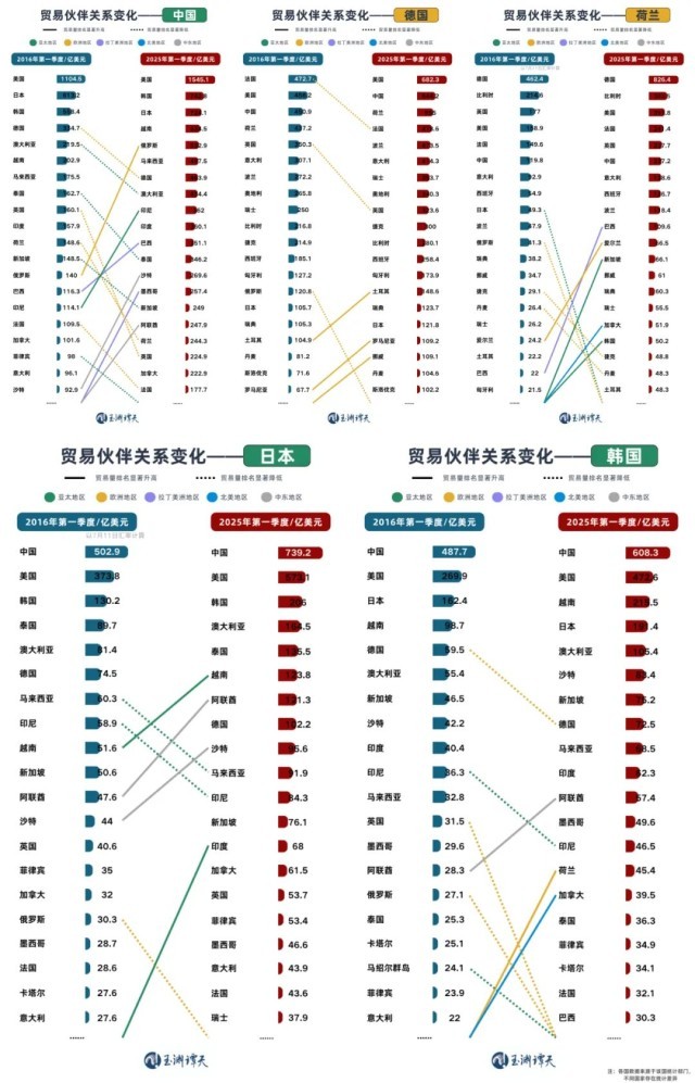 中国特别凸起。一方面,亚太国度逐步正在中国商业伙伴中占领从导地位。中国前十大商业伙伴中,一半以上是亚太国度,包罗韩国、日本、越南、马来西亚、印尼和印度等。另一方面,除了深化亚太区域经济合做,中国还取拉丁美洲、中东等地域的国度成立了愈加慎密的联系。相关地域国度正在中国商业伙伴排名中的大幅上升。比拟于美欧的区域集中,跨区域多元有一个特点是,相关国度不只参取出产环节,也参取高附加值环节(如研发、手艺尺度制定)。这个数据背后,中国不只无效分离了市场风险(这正在中国寻求美国农产物进口替代中有所表现),通过参取拉美国度的根本设备扶植、手艺合做和财产投资,中国帮帮拉美国度提拔其经济附加值的同时,两边正在价值链上的也正在配合提拔。2025年,全球商业款式正处于一个环节的转机点。美国关税政策的朝四暮三虽然制制了不确定性,但也促使全球商业系统加快向实正多元的标的目的成长。通过数据阐发,我们能够看到,虽然美国仍是全球商业的主要参取者,但其影响力正正在逐步削弱。成长中国度和新兴经济体,出格是亚洲、拉丁美洲和中东地域,正成为全球商业新的增加点。多元化的商业合做以及国际关系关系的沉构,都表白全球商业系统正正在顺应新的挑和,并朝着更有韧性和包涵性的标的目的成长。